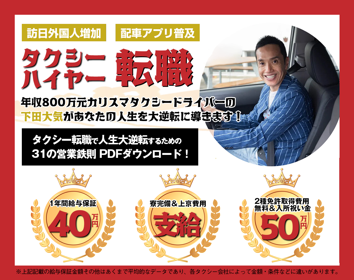 幾度の事業破綻と自己破産、アルコール・ギャンブル依存の生活から下田先生を救い出し、人生大逆転に導いたのはタクシー転職だったそうです。人生の地獄を味わった下田先生だからこそできる手厚いサポートはなにより皆さんのお役に立てると思います。まずは下田先生の動画をご覧くださいー。人生一発逆転の手段としてタクシー転職をお勧めしています。