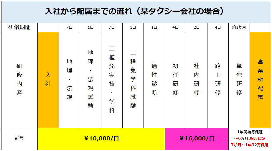 以下の表は入社後の流れになります(タクシー会社によって多少異なります)。なお、地理試験は現在廃止されてますので、以前より気楽に取り組むことができます。