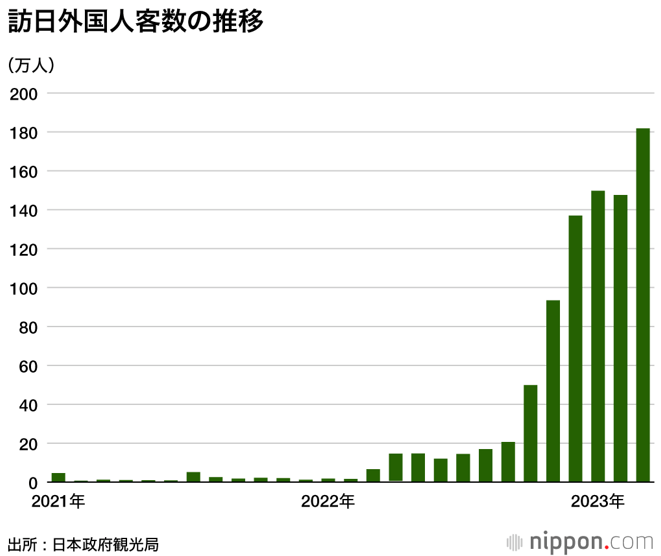実際に、日本政府観光局がまとめた2023年3月の訪日外国人数(推計値)は、前年同月(6万6121人)の27倍超の181万7500人でした。2月147万5300人からも34万人以上増え、22年10月の個人旅行再開以降で過去最多を記録。コロナ禍前の19年3月(270万人)の65.8%の水準まで回復しました。